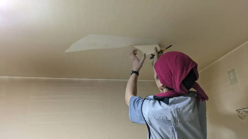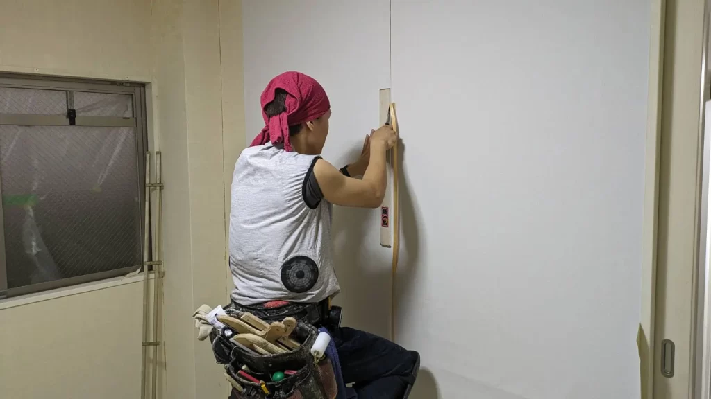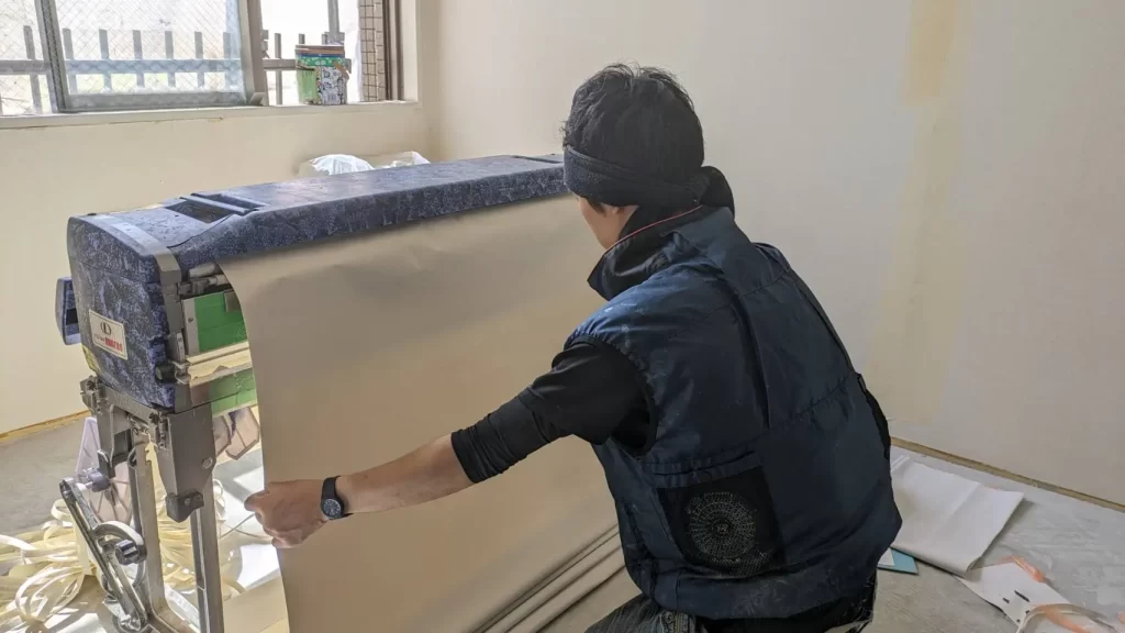 まず寸法をとり、クロスに糊をつけるところから始まります。