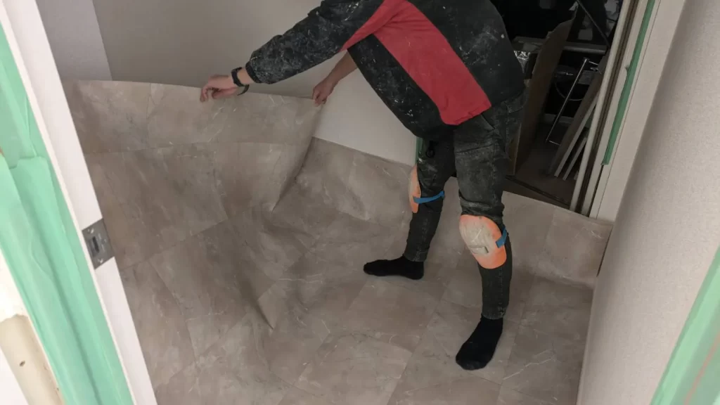 既存のCFが捲れてきている場合や敷居などの塵がない場合は剥がしますが、弊社では重ね貼りを推奨しております。